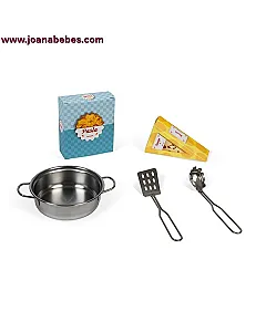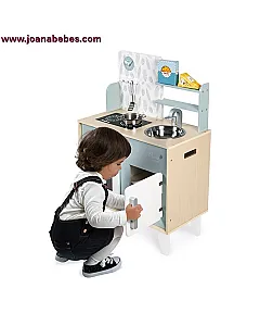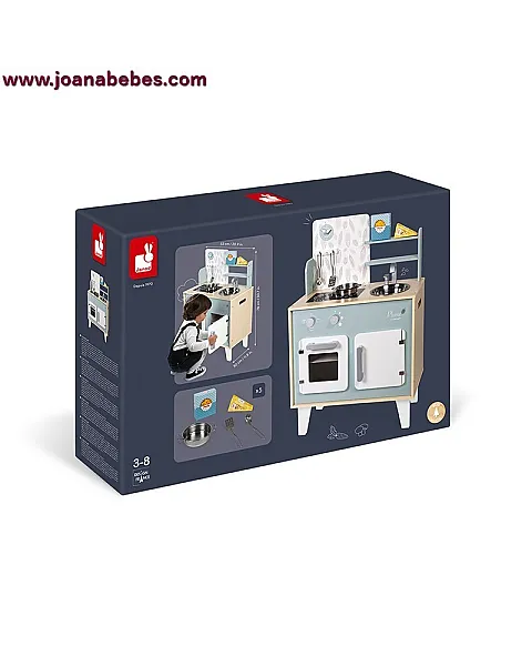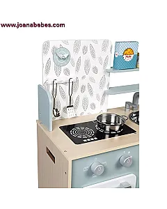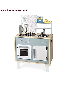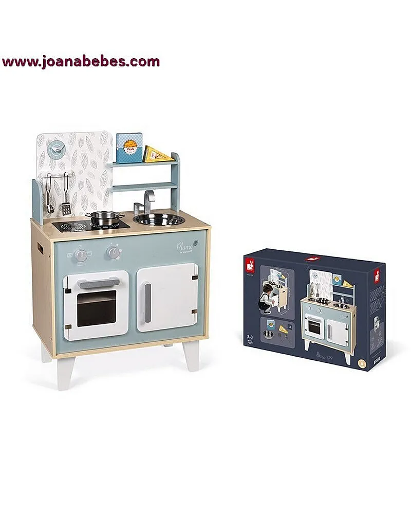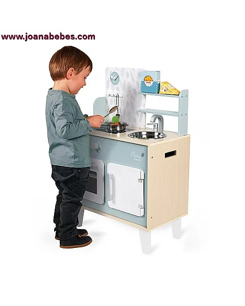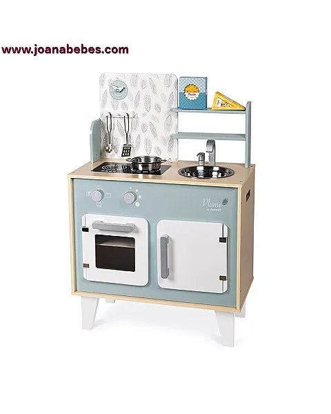 ¡Has como papá y mamá, prepara deliciosos platos para sus amigos y conviértete en un auténtico pequeño chef de cocina! Cocina Plume totalmente de madera con ganchos para colgar la cuchara de espaguetis y la espátula metálica, acompañadas de una cacerola metálica y 2 cajas de comida de cartón (pasta y queso). Al igual que una cocina de verdad, está equipada con 2 botones giratorios con sonido para encender las 2 placas de inducción, con un horno y un armario con puertas magnéticas, un fregadero de metal inoxidable y un reloj. 5 accesorios. Altura de la encimera: 50 cm. Dim: 53 x 30 x 78 cm