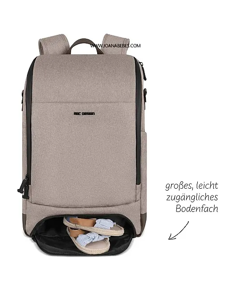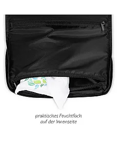 En el interior hay dos bolsillos, uno de ellos para artículos húmedos. También se incluye un cambiador higiénico para viajes, un bolsillo canguro y un portabotellas extraíble y aislante. El amplio compartimento principal con apertura frontal ofrece mucho espacio, ideal para ir de compras por la ciudad o para dar un largo paseo.