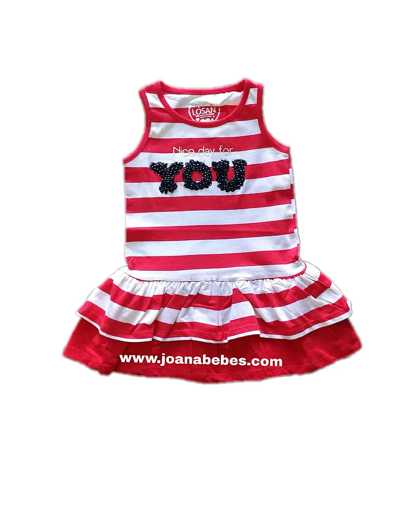 Vestido de rayas con falda de volantes para niña. Vestido de punto sin mangas de color azul y blanco con parche de tul de color rojo. Elástico en la cadera y falda de volantes uno de rayas y otro liso de color ROJO