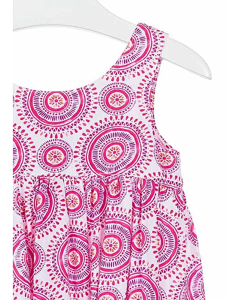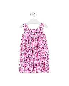 Vestido con estampado étnico de color rosa para niña. Vestido en tejido voilé de tirantes con canesú en el delantero y en la espalda. Abertura en la espalda con botones de plástico y presillas de goma de color rosa.