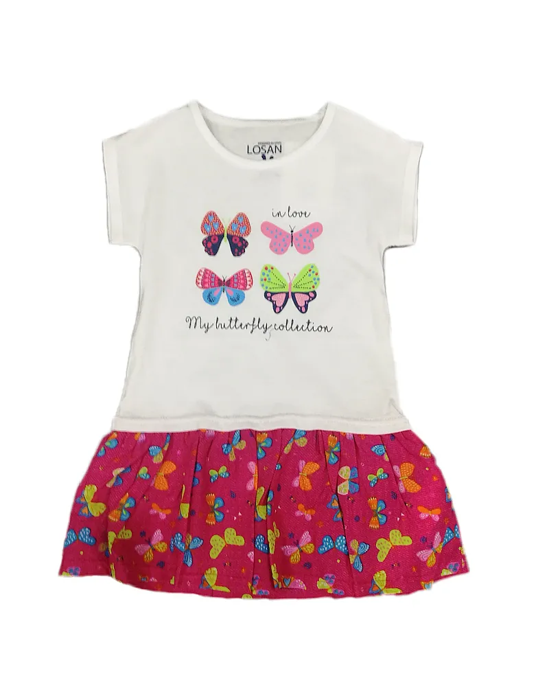 Vestido de manga corta con mariposas estampadas para niña. Vestido de manga corta de punto de color blanco combinado con falda en tejido voilé . Con elástico en la cintura.