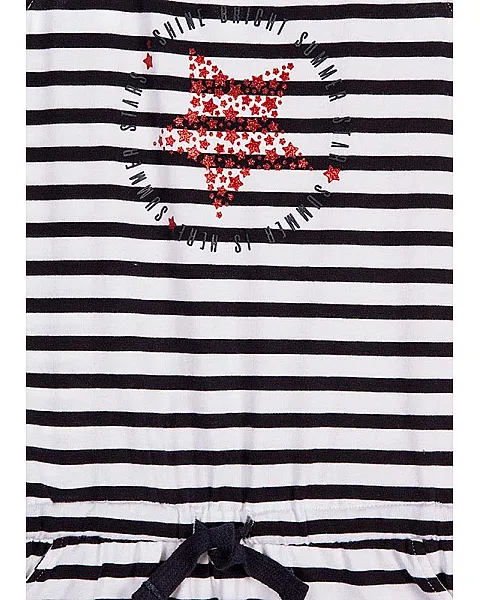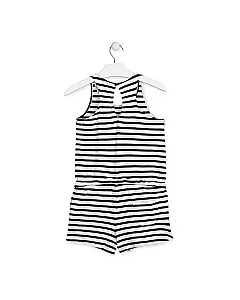 Mono corto de rayas marineras para chica. Vestido con espalda nadadora con abertura con botón de plástico de color azul y presilla. Cintura elástica con cordón ajustador. Estampado de rayas de color azul. Estrella de color rojo estampada en el delantero.