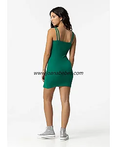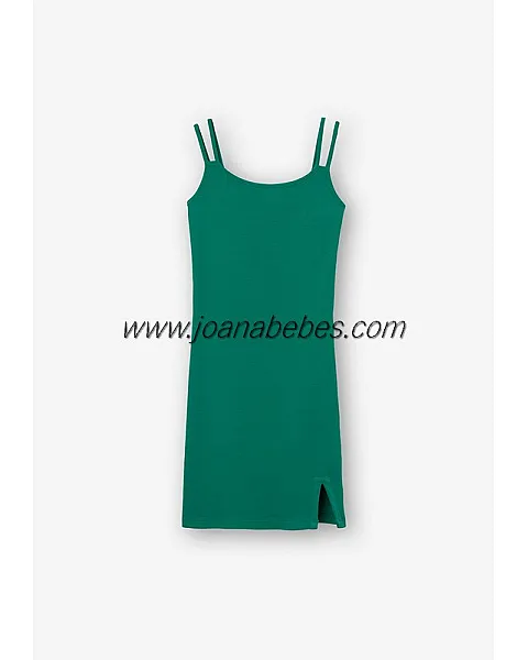 Vestido con cuello redondo y tirantes efecto doble. Abertura frontal.