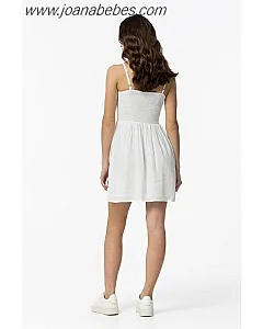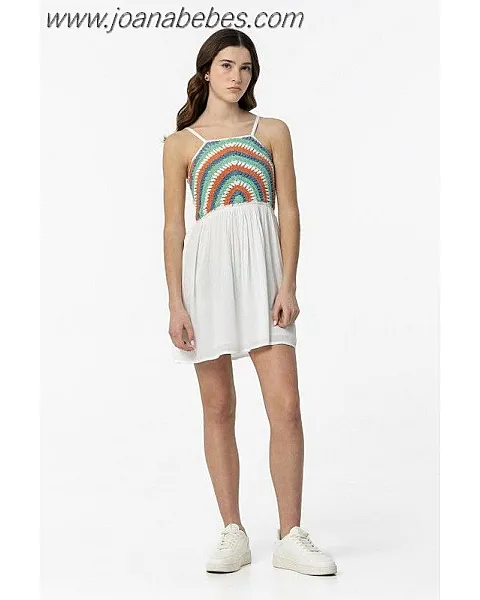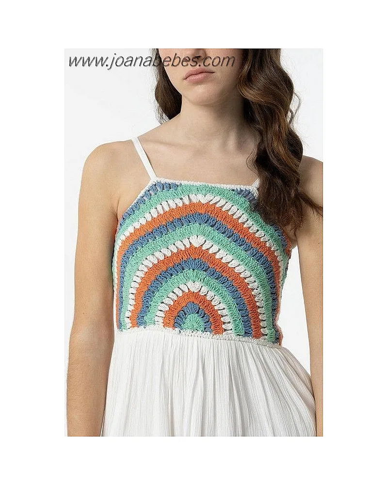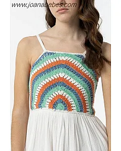 Vestido de escote recto y tirantes finos ajustables. Detalle crochet multicolor y elástico tipo nido de abeja en espalda.