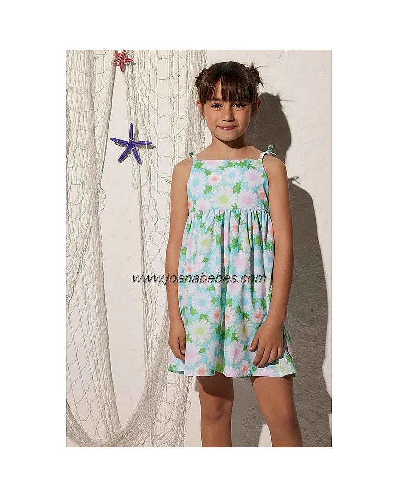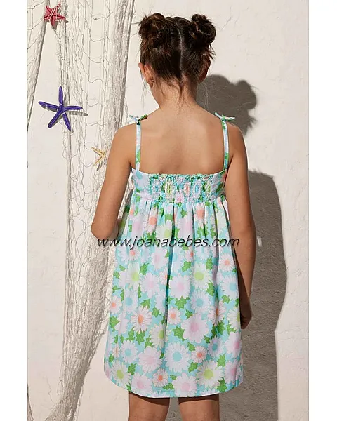 Party time Baby Collection. Vestido flores para niña. Tirantes finos que se anudan en los hombros y permiten ajustar la longitud del vestido. Falda es amplia y cómoda, ideal para jugar y moverse con libertad. Diseño es fresco y veraniego, perfecto para días calurosos.