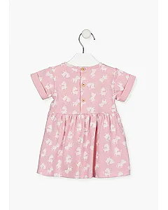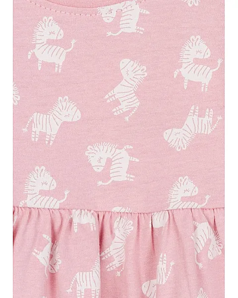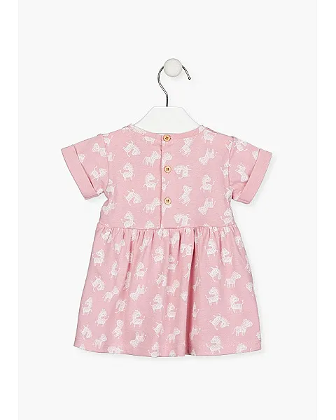 Vestido de manga corta con cebras para bebé niña. Vestido en tejido de algodón orgánico con cuello redondo. Elástico en la cintura. Vuelta en las mangas. Abertura en la espalda con botones.