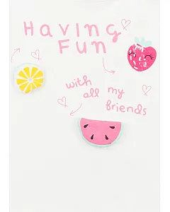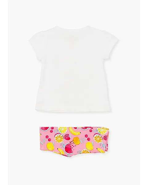 Conjunto camiseta de color blanco con parches y leggins para bebé niña. Conjunto de camiseta de manga corta y cuello redondo en tejido de punto de algodón. Mensaje en el pecho con frutas. Abertura en el hombro con automáticos. Y leggins de color rosa con frutas estampadas y cintura elástica.