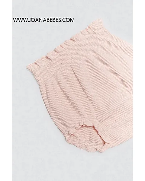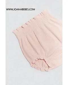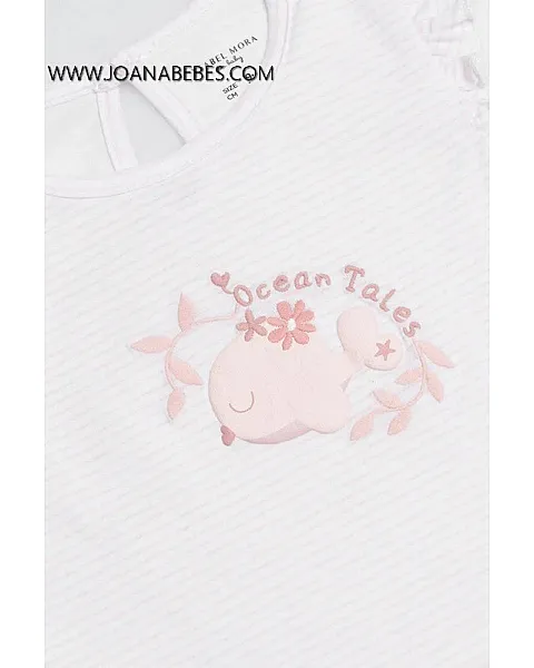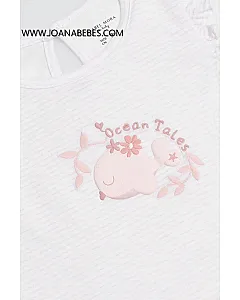 Conjunto de bebé de tirantes anchos con volados. Compuesto por algodón 100% natural para que los más pequeños puedan disfrutar combinando la comodidad y el estilo. Textura fina y suave con un estampado de rayas rosa claro y la figura de una ballena en el centro. La braga es con textura.
