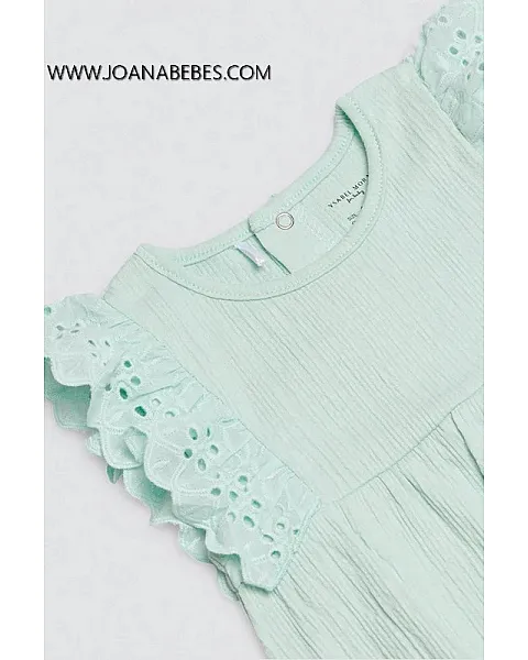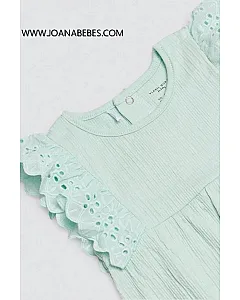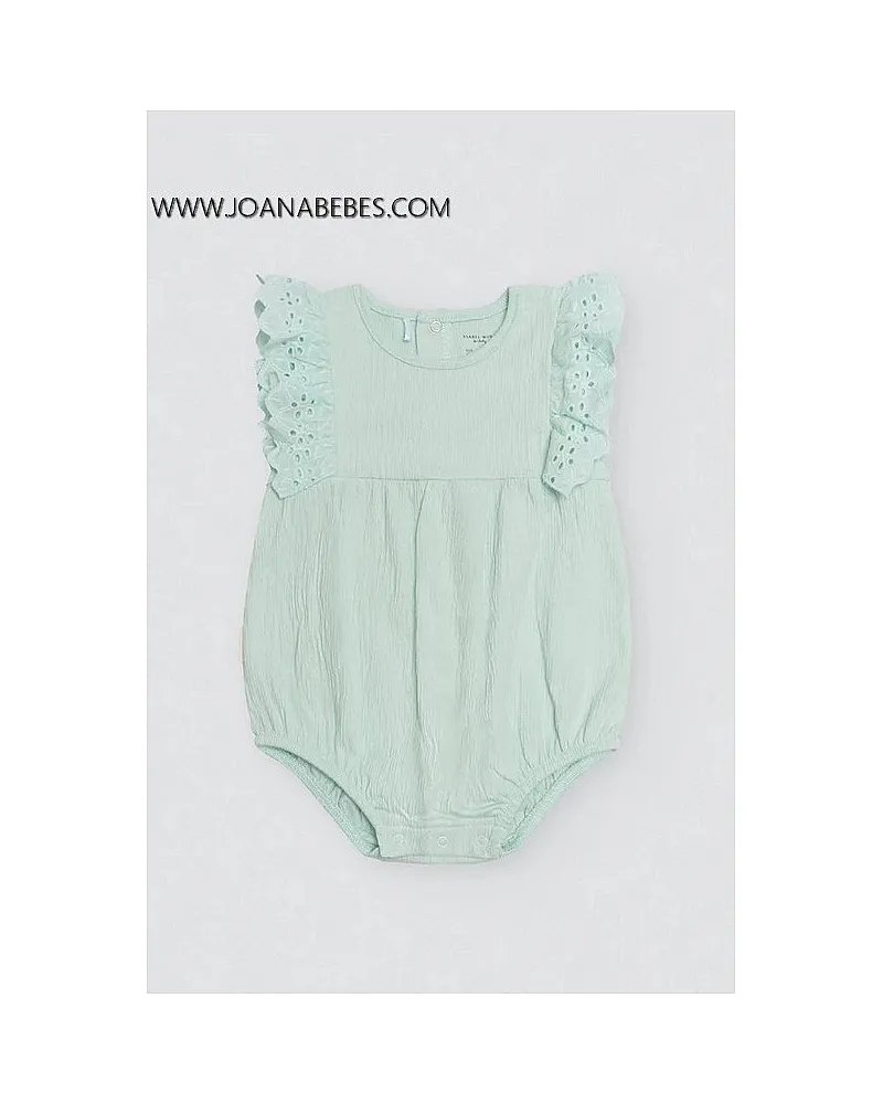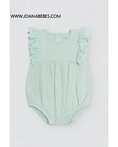 Rana de bebé sin mangas con volantes en la sisa. Está hecho con algodón 100% natural, lo que lo hace suave y transpirable para la piel delicada del bebé. La ranita tiene cierres de botones a presión en la parte inferior que hacen que el cambio de pañales sea rápido y fácil.