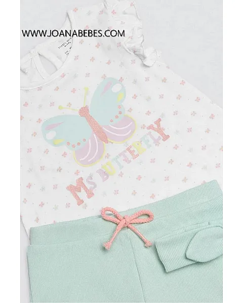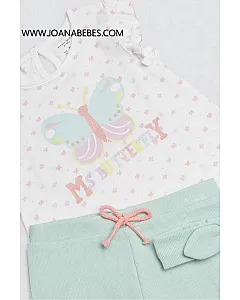 Conjunto de bebé formado por una camiseta, unos shorts y una diadema con un lazo. La camiseta tiene volantes en las mangas y un estampado floral con una mariposa en el centro. Los shorts son de un tejido muy cómodo para que el bebé se sienta a gusto en todo momento. Además, este conjunto también está formado por una diadema a juego. El conjunto está hecho completamente de algodón 100% natural, lo que lo hace suave y transpirable para la delicada piel de tu bebé.