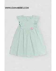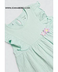 Vestido de bebé sin mangas y con tirante ancho con volantes, tiene apliques de flores en el centro derecho delantero. Modelo de cuello redondo con volantes delante que se prolongan por los hombros y costuras fruncidas en la falda para dar vuelo. El vestido está hecho con algodón natural, lo que lo hace suave y transpirable para la delicada piel de tu bebé.