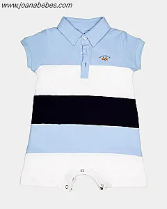 Pelele de bebé confeccionado en tejido de punto piqué de rayas en color azul. De manga corta, cuenta con cuello y cierre de tres botones y cierre de corchetes. Personalizado con bordado de logo Spagnolo de banderas a contraste en el pecho.