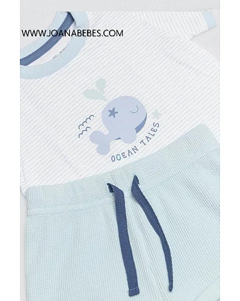 Conjunto de bebé de manga corta y pantalón corto de algodón natural. Camiseta blanca rayada con figura central de tiburón. El short es azul claro y combina perfectamente con la camiseta. Con este conjunto tu bebé se verá ideal y se sentirá cómodo para jugar las tardes de verano.