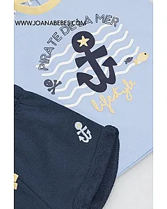 Conjunto de bebé de manga corta y pantalón corto de algodón natural. Con este conjunto tu bebé se verá ideal y se sentirá cómodo para jugar las tardes de verano. Camiseta con ancla en el centro y mangas a rayas. El short es azul con detalle de bordado con motivo de ancla en el lado derecho inferior.