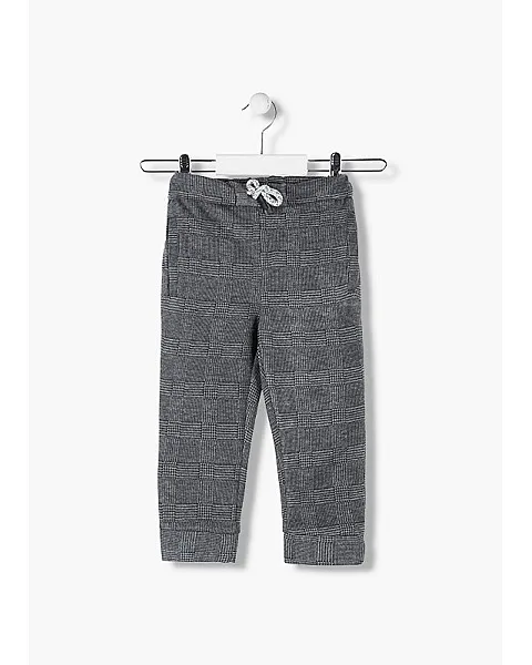 Pantalón de punto de cuadros para niño. Pantalón de color gris con ajustador interior en la cintura y cordón decorativo. Puños en el bajo. Bolsillos laterales y un bolsillo trasero.