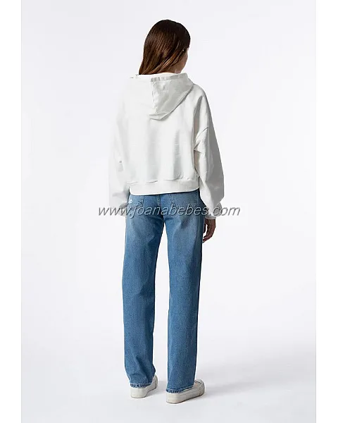 Jeans de tiro alto y pernera recta y cinco bolsillos. Cierre frontal con cremallera y botón metálico.Detalle rotos.