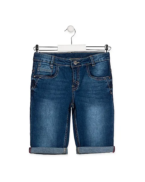 Bermuda en tejido tejano de la colección esencial para chico. Bermuda con vuelta en el bajo. Abertura con botón de gancho metálico...