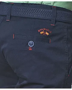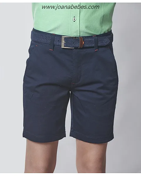 Bermuda básica de niño confeccionada en tejido gabardina elástica. Cuenta con dos bolsillos laterales, dos bolsillos traseros y pespuntes a contraste. Personalizada con logo Spagnolo de banderas a contraste en la parte trasera.