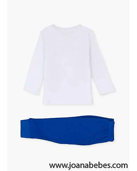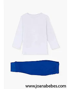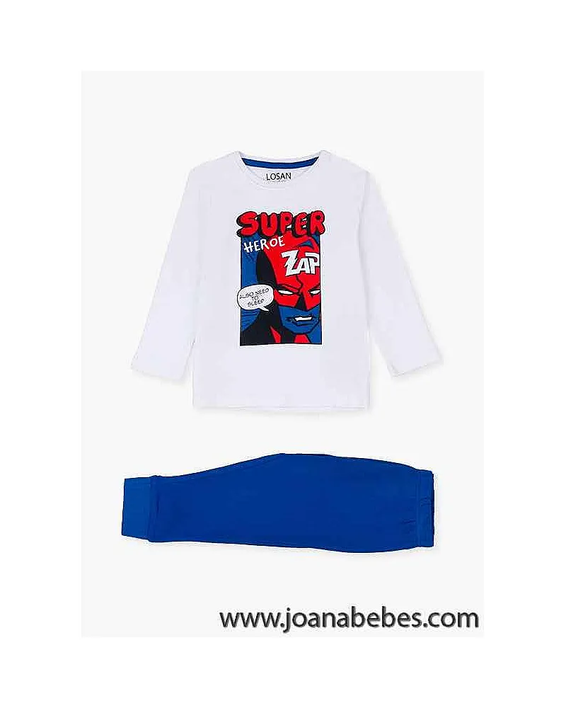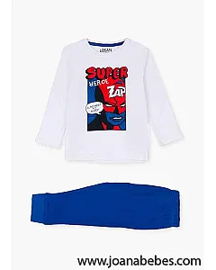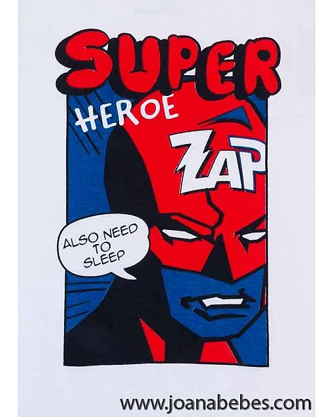 Pijama de algodón de manga larga para niño. Pijama de camiseta con cuello redondo con super héroe estampado en el delantero. Pantalón de color liso con cintura elástica y puño en el bajo. Disponible en varios colores. Presentado en bolsa de tela.