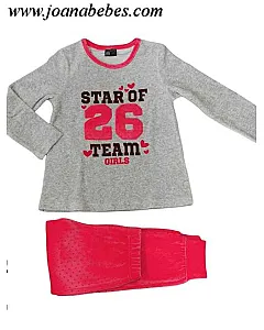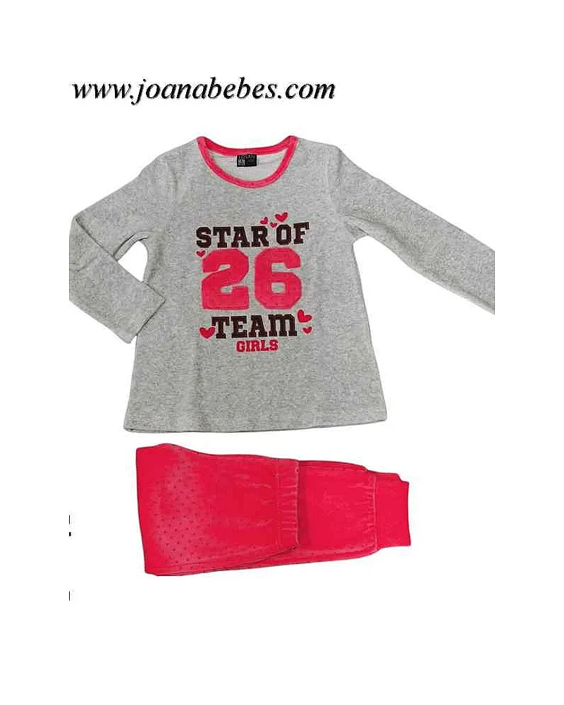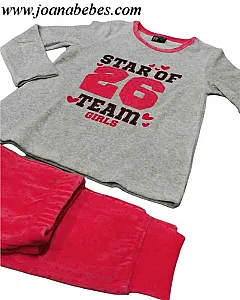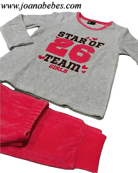 Pijama con estampado para niña. Pijama de dos piezas en tejido de terciopelo. Camiseta manga larga y con cuello redondo con estampado delantero. Y pantalón con puños y goma en cintura todo estampado