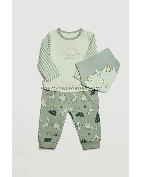 Conjunto de bebé compuesto por tres piezas con tejido de algodón natural. Prenda confeccionada en un tejido suave y agradable gracias a su interior afelpado.
