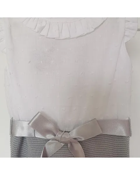 Pelele sin mangas combinado, la parte de arriba es de plumeti y cuello con volante, y la parte de abajo de punto gris.
