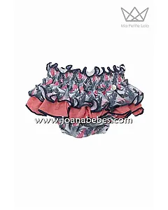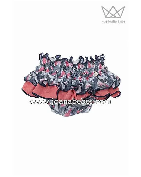 Falda braguita tropical con doble volante, volante superior con estampado tropical y volante inferior con tejido color coral.