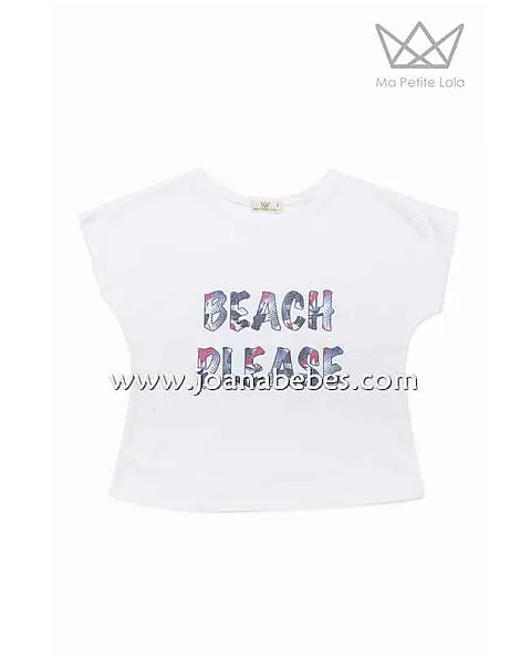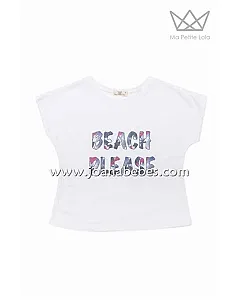Camiseta niña con dibujo Beach Please e ilustración tropical en algodón