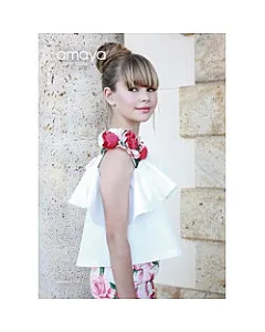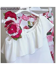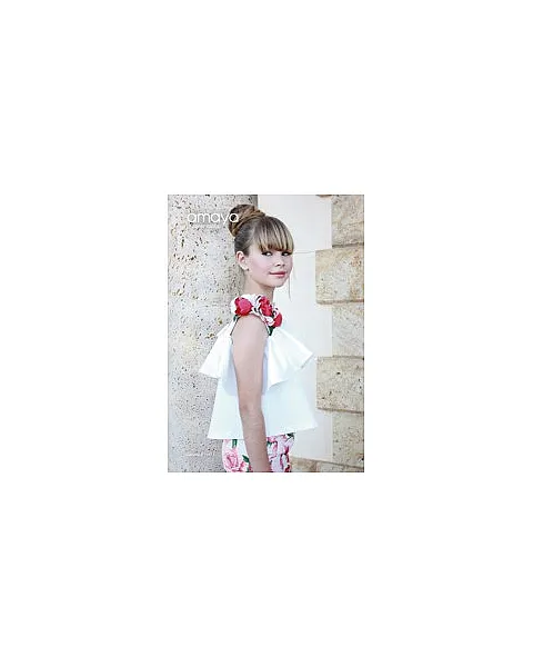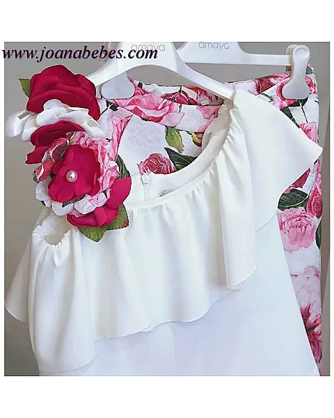 Conjunto de blusa y pantalón de niña Amaya. La blusa tiene goma fruncida y un volante. Lleva por un lado una manga y por el otro un tirante hecho con decoración de rosas y una perla blanca, se abrocha con cremallera por la espalda. Los pantalones llevan un estampado de flores a conjunto del tirante de la blusa, la cintura se puede ajustar con botones y lleva bolsillos en la parte delantera.