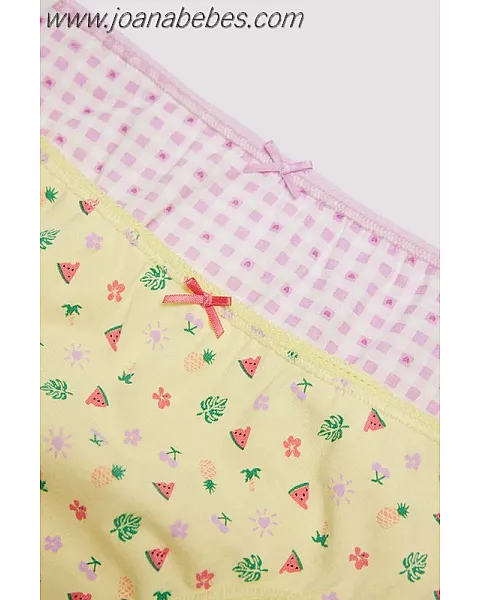 Pack de 2 bragas para niñas confeccionadas en algodón natural. Una braga tiene un estampado de vichy rosa y blanco, mientras que la otra es de color amarillo con un estampado de flores. Ambas bragas están diseñadas para ser suaves y cómodas en contacto con la piel de las niñas. El algodón es un material transpirable que evita la acumulación de humedad y mantiene la piel fresca y seca durante todo el día. La braga de vichy rosa y blanco tiene un diseño clásico y elegante, mientras que la braga amarilla con estampado de frutas tiene un estilo más llamativo y divertido. Esto ofrece a las niñas la opción de elegir entre dos estilos diferentes según su estado de ánimo o preferencias personales. ¡Que elijan su preferida!