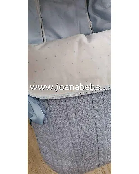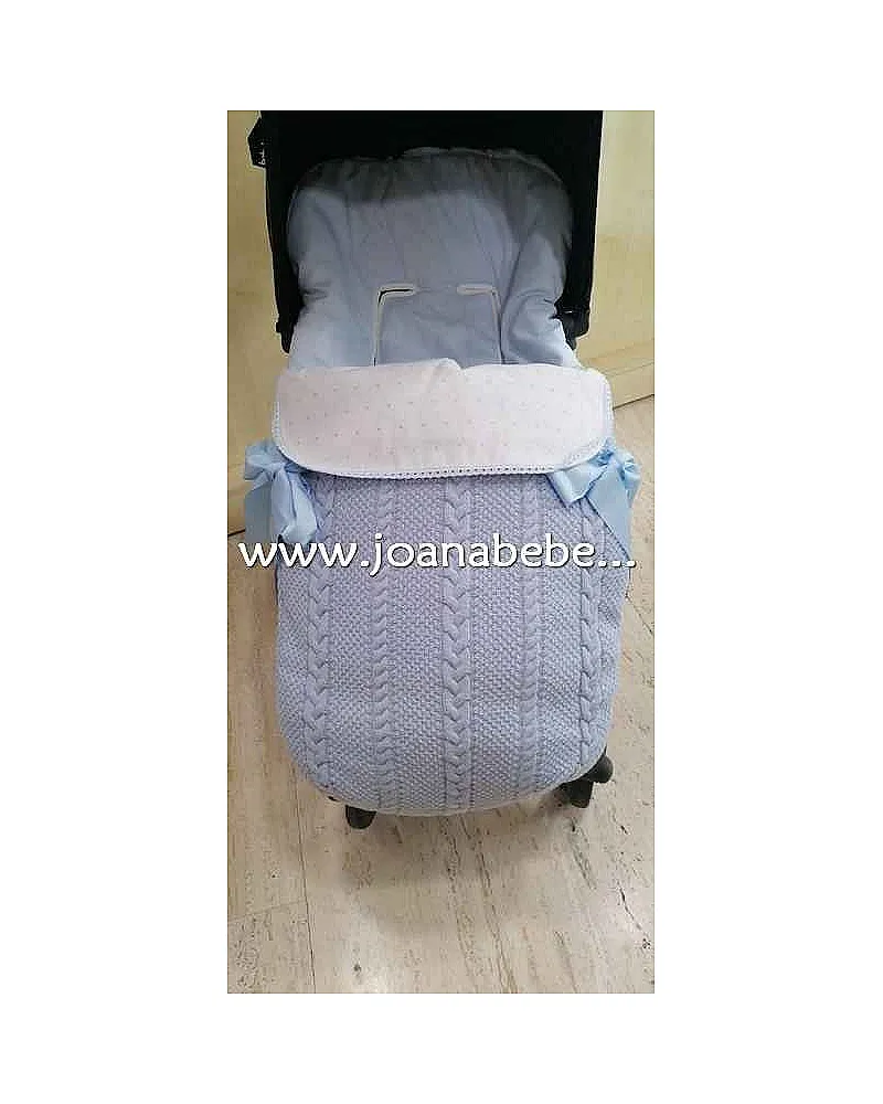 Saco de silla con la parte exterior de tricot con bonitos ochos, el embozo de botista con bodoques bodados, y en interior del pique celeste.