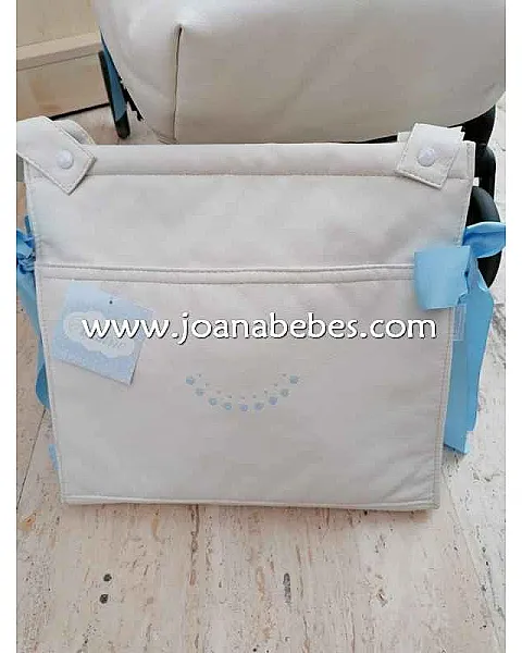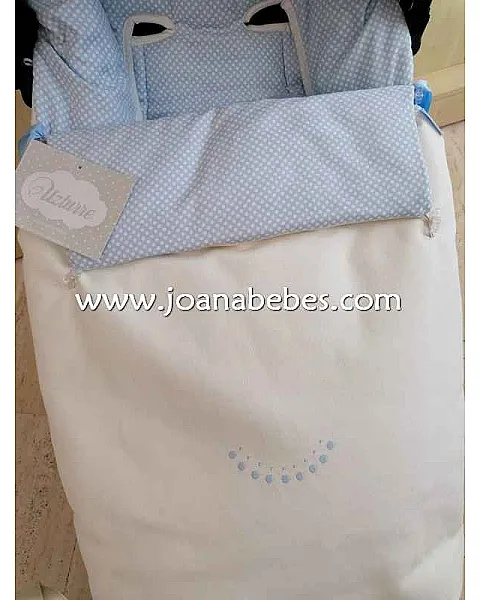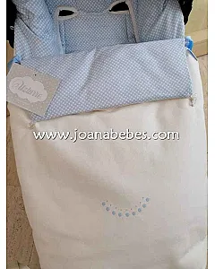 SACO DE SILLA DE LA MARCA UZTURRE, UNA GRAN MARCA EN LA QUE PUEDES CONFIAR, EL SACO ES DE POLIPIEL BLANCO ROTO CON UNOS BORDADOS DE CIRCULOS CONTIGUOS MUY DISCRETO Y ELEGANTE, EL INTERIOR ES DE MICROPANA  CELESTE CON LUNARITOS PEQUEÑOS BLANCO UN SACO ESPECTACULAR, CON SU PANERA A JUEGO.