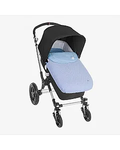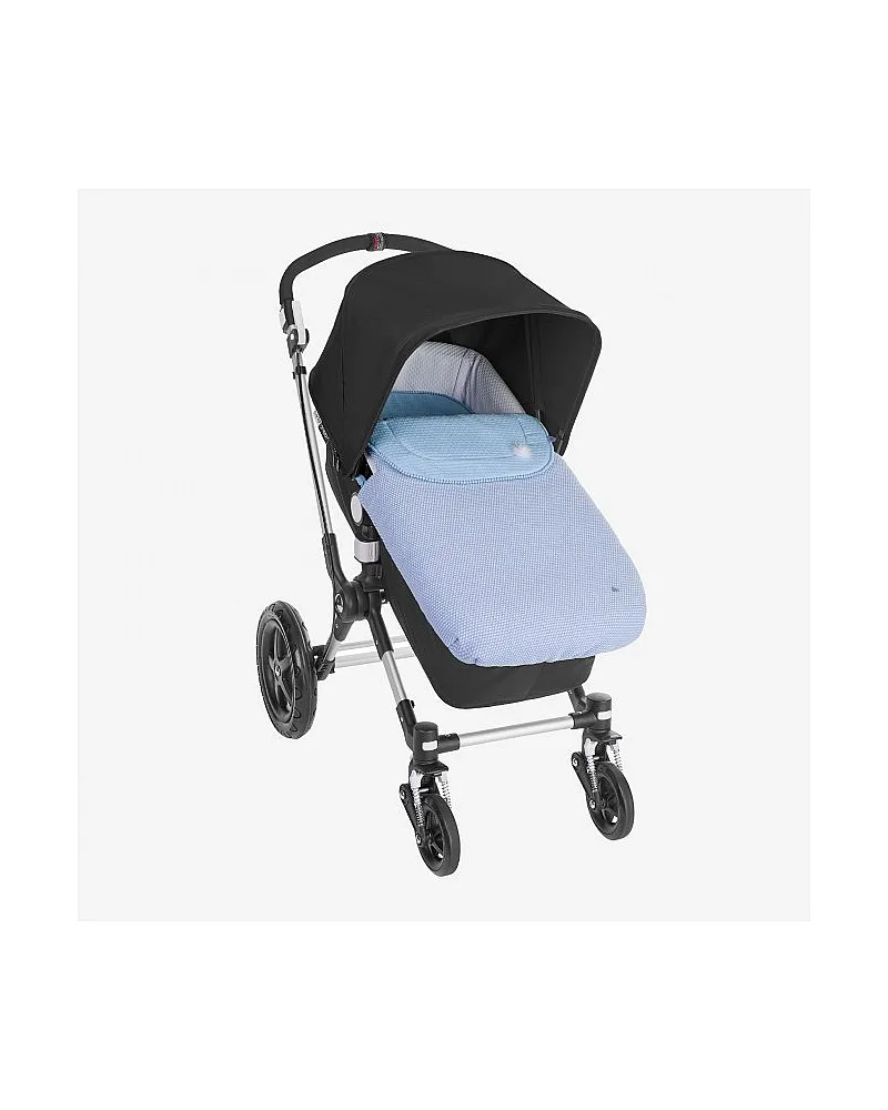 Colcha ajustable de punto de arroz bicolor en el cubrepiés. Embozo redondo de piqué. Detalle de pompón de pelito.
