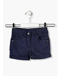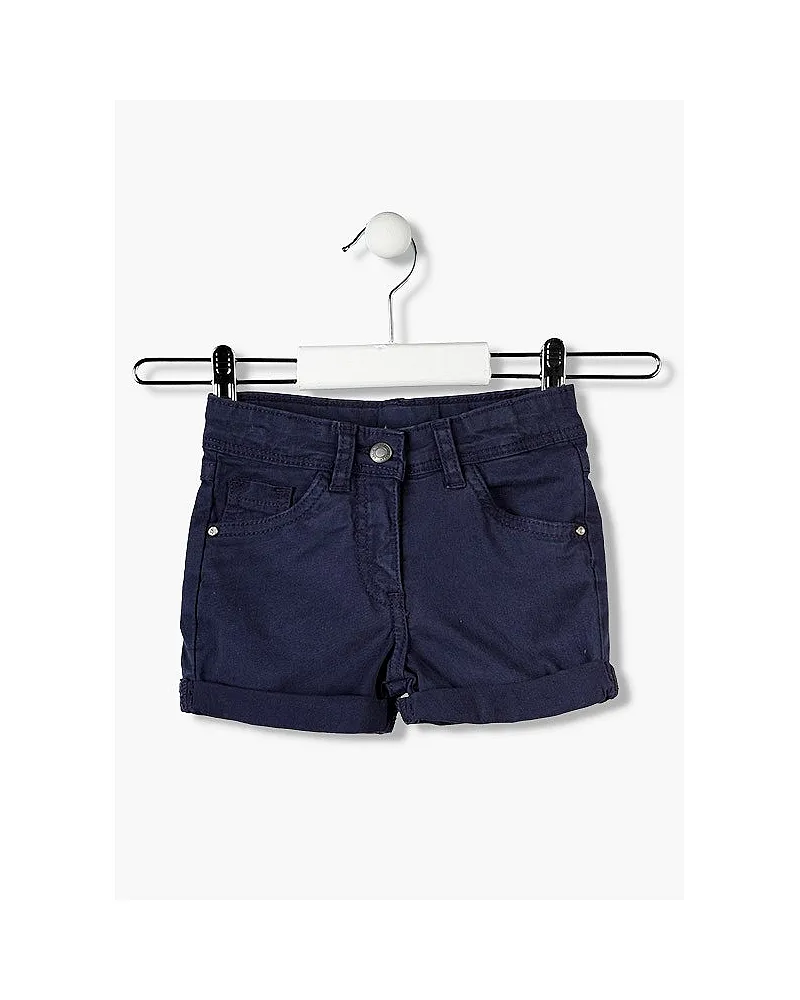Short en tejido de sarga para niña. Short con vuelta en el bajo. Abertura con botón metálico personalizado de marca Losan. Trabillas en la cintura y ajustador interior de goma con botón. Remaches de brillantitos en los bolsillos delanteros. Etiqueta imitación cuero de marca cosida en el bolsillo trasero.
