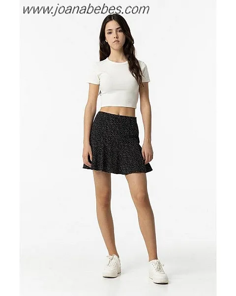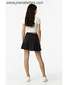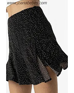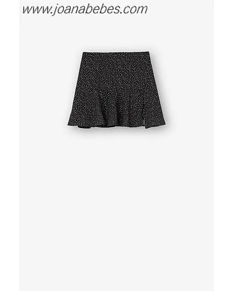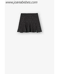 Falda shorts de tiro alto con detalle volante. Estampado all over. Cierre lateral con cremallera oculta en costura.