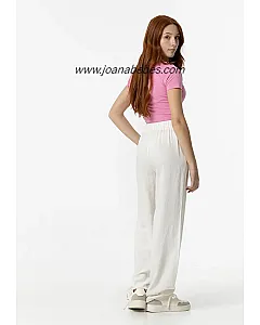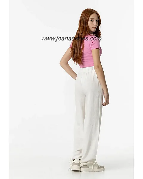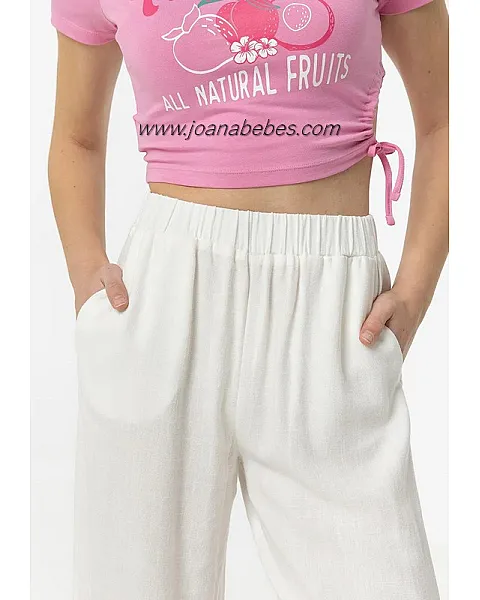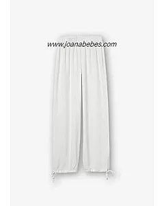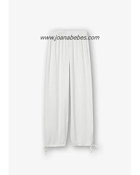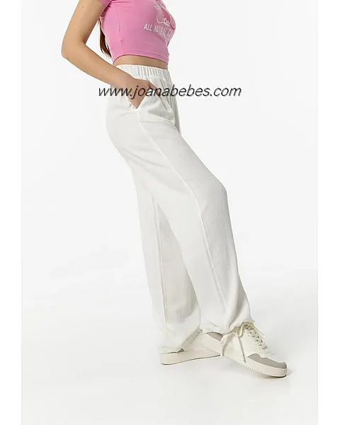 Pantalón de tiro alto confeccionado con mezcla de lino con cinturilla elástica. Bajo ajustable con lazo. Bolsillos laterales.