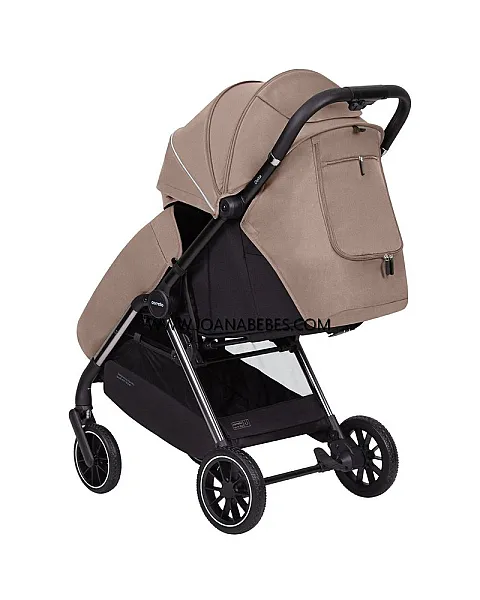 Para plegar el cochecito se necesita una sola mano. El cochecito se pliega automáticamente y se mantiene en posición vertical sin que el tejido toque la superficie sobre la que se apoya. Bloqueado para evitar que se pliegue y despliegue accidentalmente.