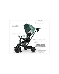 - Incluye: Un triciclo con reposapiés, arnés de 5 puntos, respaldo acolchado, barra de seguridad extraíble, respaldo desmontable, pedales antideslizantes, capota extraíble con protección UV, manillar parental ajustable y cestar frontal y trasera.