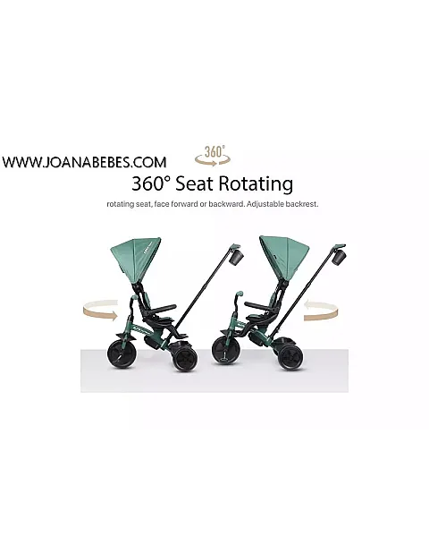 Este Triciclo Evolutivo Qplay 6 En 1 Elite Verde ofrece seis modos distintos de uso para acompañar cada etapa del crecimiento del niño: desde cinturón y apoyo como cochecito de paseo, pasando por fase de triciclo con control parental, hasta llegar al modo de pedaleo independiente. El asiento gira en 360°, lo que permite colocarlo mirando hacia los padres durante los primeros meses, o hacia delante cuando ya quiera ver el camino, favoreciendo tanto la interacción como la autonomía. Se pliega parcialmente para facilitar transporte o almacenaje cuando no está en uso.