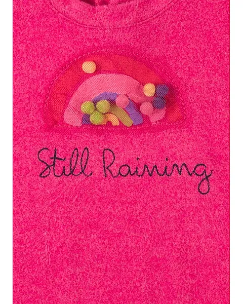 Conjunto de vestido con falda de tul y leotardo para bebé niña. Conjunto de vestido de color rosa de manga larga de punto. Cuello redondo con cierre en la espalda con botones a presión. Mensaje bordado en el delantero y parche de tul relleno de bolitas de colores. Falda de color azul con estampado de colores. Forro en la falda de punto. Y leotardo de tricotosa de color rosa con elástico en cintura y bolitos de colores.
