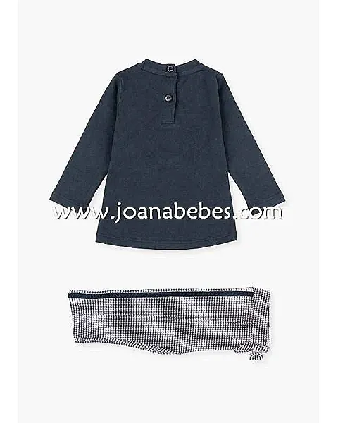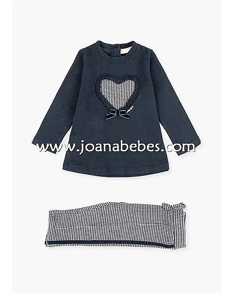 Conjunto de camiseta de manga larga con corazón y pantalón para bebé niña. Conjunto de camiseta de color azul de algodón efecto melocotón al tacto y cuello redondo. Abertura en la espalda con botones. Lazo de terciopelo. Y pantalón con jacquard de pata de gallo en color azul con lazo decorativo en la cintura. Piezas de terciopelo en los laterales y cintura elástica.