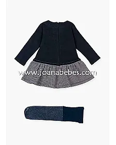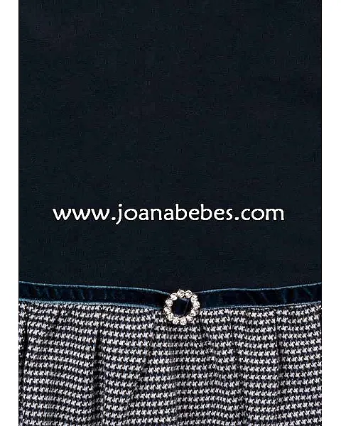 Conjunto de vestido con falda y media de color azul para bebé niña. Conjunto de vestido de color azul de manga larga en tejido de pata de gallo. Cuello redondo. Pieza de terciopelo en la cintura y aplique de brillantitos. Abertura en la espalda con cremallera oculta. Y media con detalle de hilo de lurex. Cintura elástica.