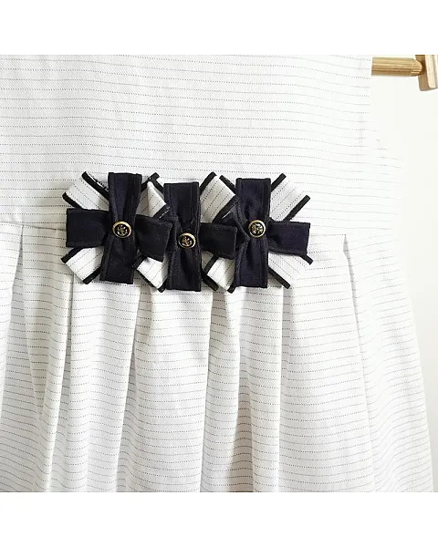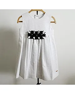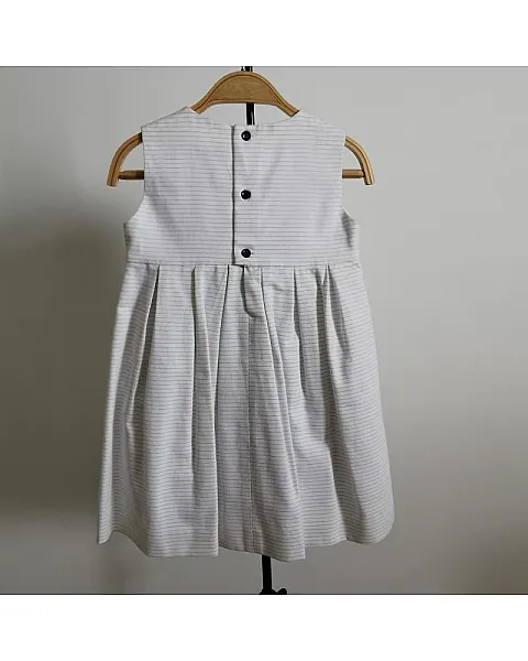 Vestido de estilo marino, con fondo blanco y rayitas muy finas de color marino, en el pecho bonitas flores de tela que tiene un boton grabado con un ancla