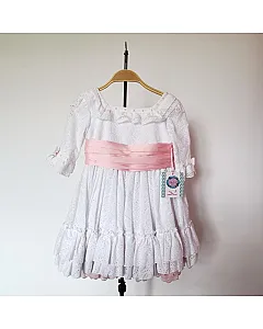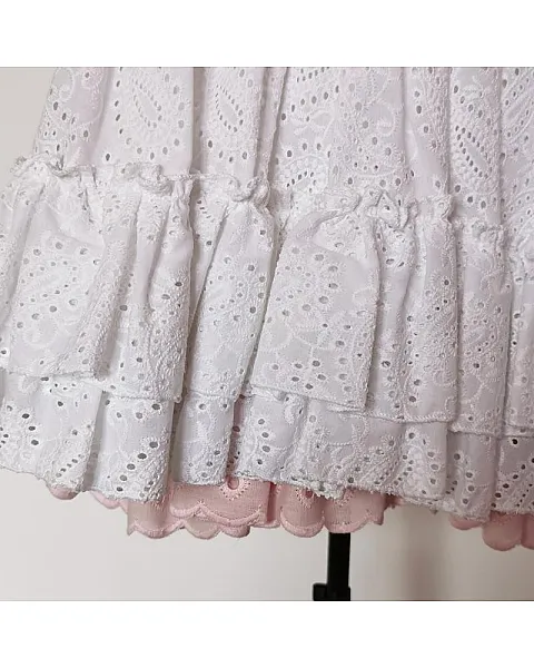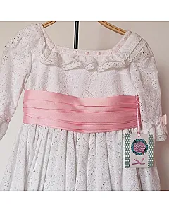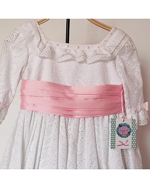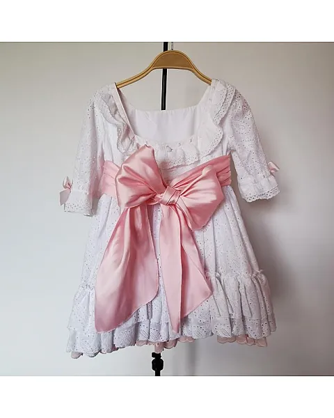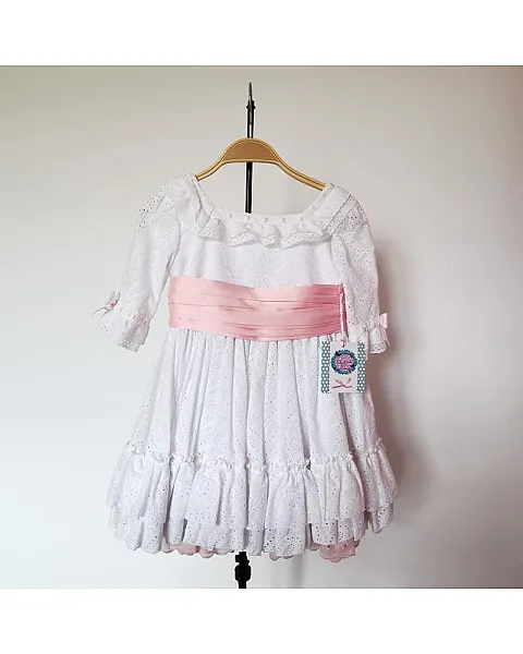 Vestido vuelo blanco de tela bordada perforada con manga al codo.