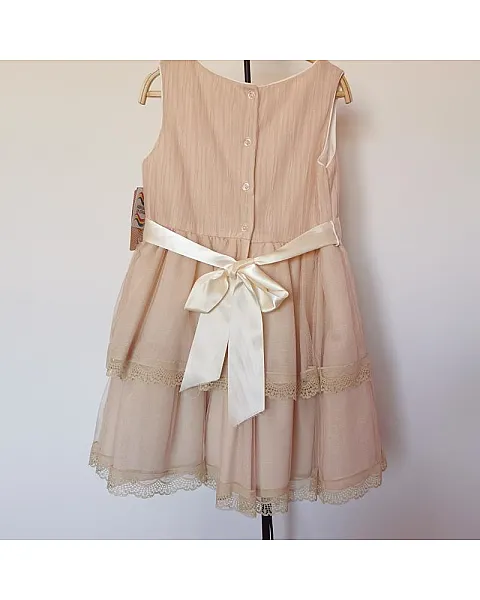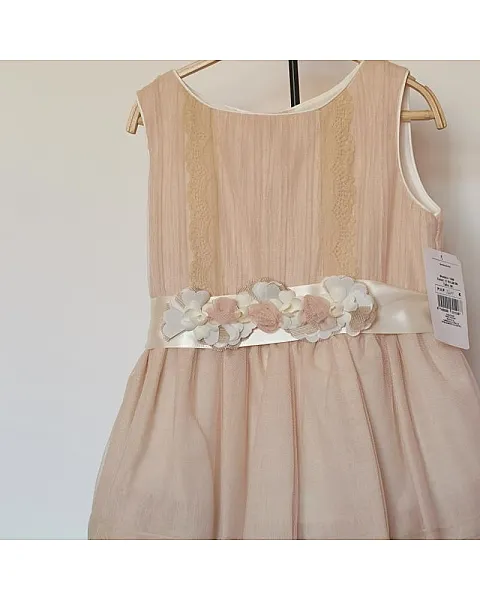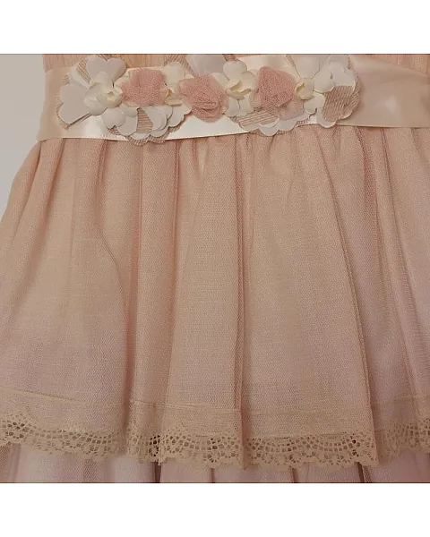 Vestido de talle alto con volantes, color maquillaje. Confeccionado con tul, encajes y cinturon floral.