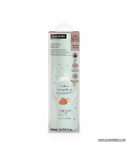 Termo para líquidos para bebés +0 meses Suavinex con capacidad 500ml:100% acero inoxidable. Su exclusiva capa interior permite que la temperatura no se transmita al exterior de la botella, posibilitando un cómodo y fácil agarreCierre hermético. La rosca hermética garantiza la seguridad e higiene en el transporte.