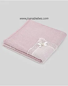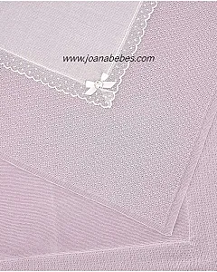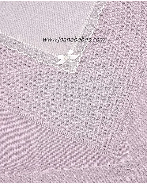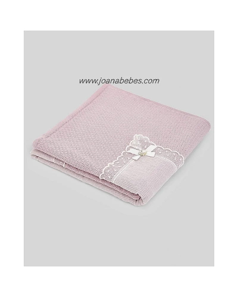 Manta en punto combinado con tejido de tul y puntilla con bodoques rematada en ondas. Placa de nácar PAZ Rodríguez con lacito. Con una medida de 73 x 98 cm, es ideal para arropar al bebé.