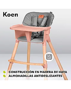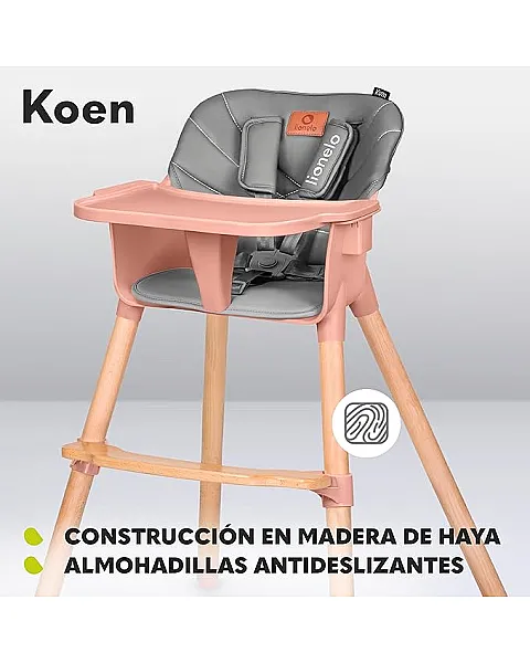 El marco ajustable Koen cuenta con una construcción robusta compuesta de madera de haya y plástico ABS, lo que garantiza su durabilidad. Las patas están diseñadas para evitar rayones en el suelo y brindar estabilidad, gracias a sus almohadillas antideslizantes. El respaldo alto y el reposapiés de la silla, garantizan comodidad y alivio para la columna del peque.
