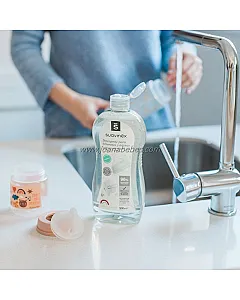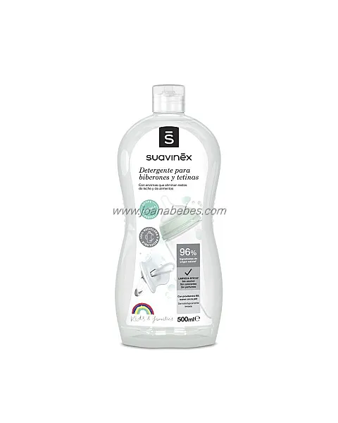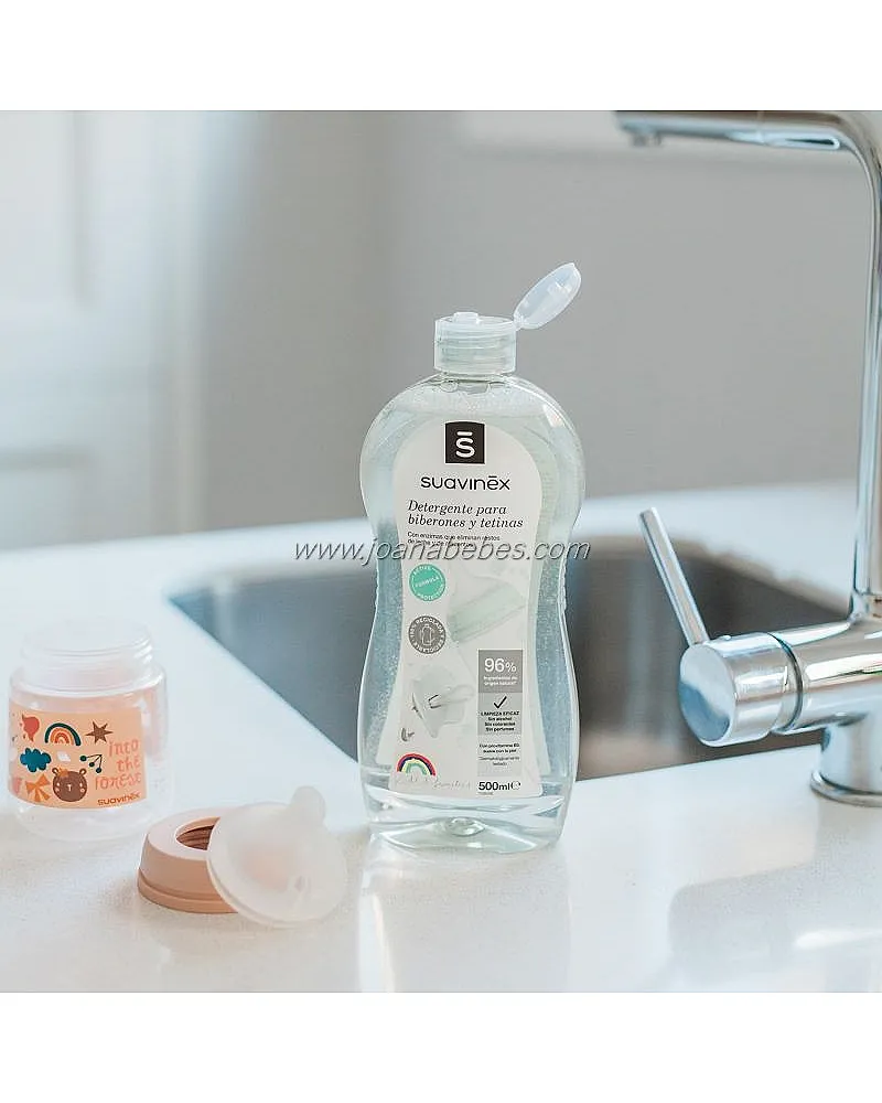 Detergente específico para biberones y tetinas Suavinex limpia de manera eficaz y segura los restos de leche, zumos y papillas